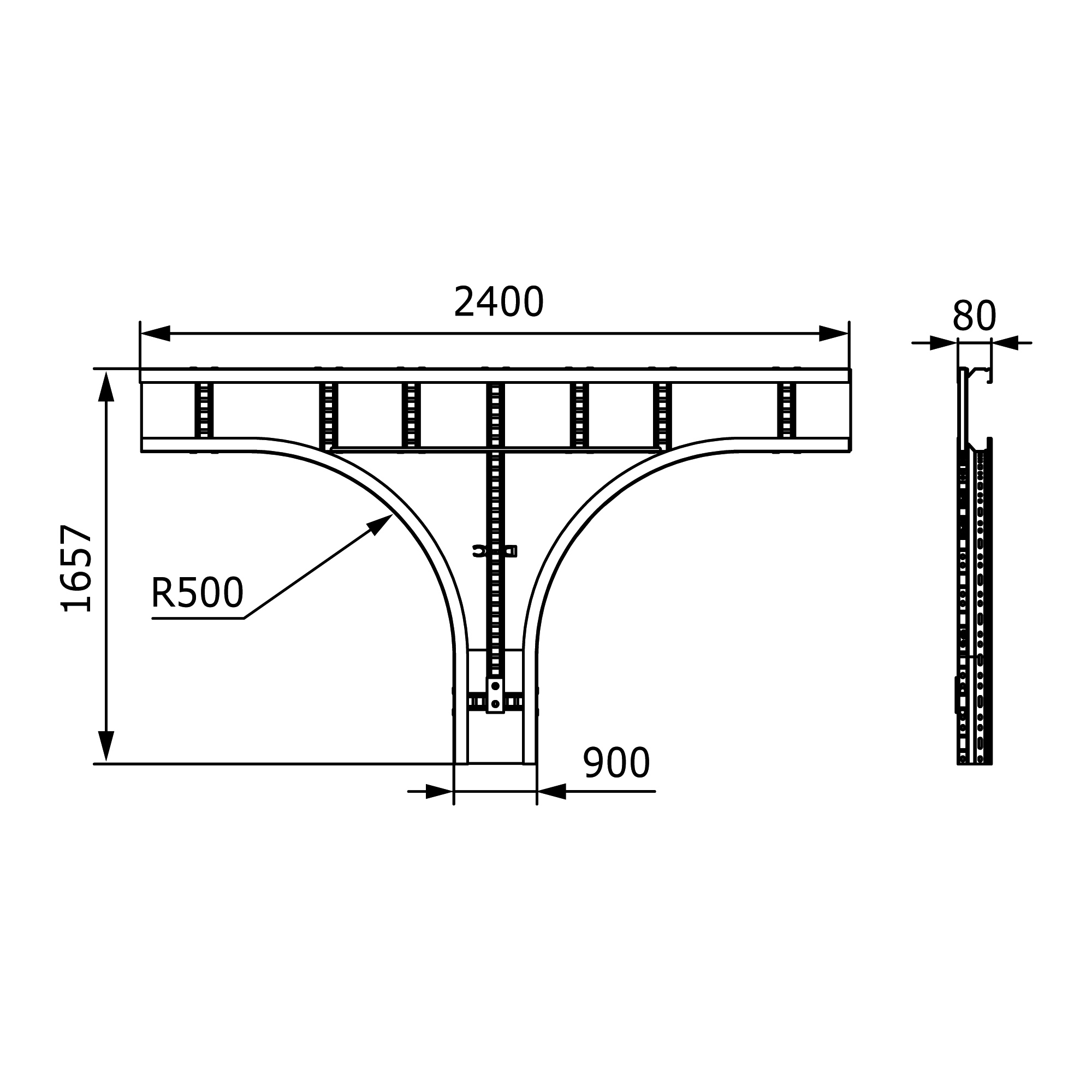 Ответвители – это аксессуары, облегчают построение кабельных трасс сложной геометрии. Они позволяют создавать ответвления кабельной трассы, построенной на основе системы тяжелых лотков "U5 Combitech". Данный аксессуар (его также называют "тройник горизонтальный") имеет Т-образную форму и применяется для организации поворотов и ответвлений в горизонтальной плоскости. Его конструктив обеспечивает плавный поворот, предупреждая повреждение кабеля при прокладке и давая возможность наиболее эффективно использовать внутренний объем аксессуара. Перфорация в аксессуарах имеет особую форму, учитывающую термокомпенсацию при скачках температур. Это позволяет реализовать свободный ход в соединениях элементов при любых условиях эксплуатации. Исполнение – "сталь, оцинкованная по методу Сендзимира". Ответвитель листовой совместим с лотками "U5 Combitech" с высотой борта 80 мм и шириной 900 мм.