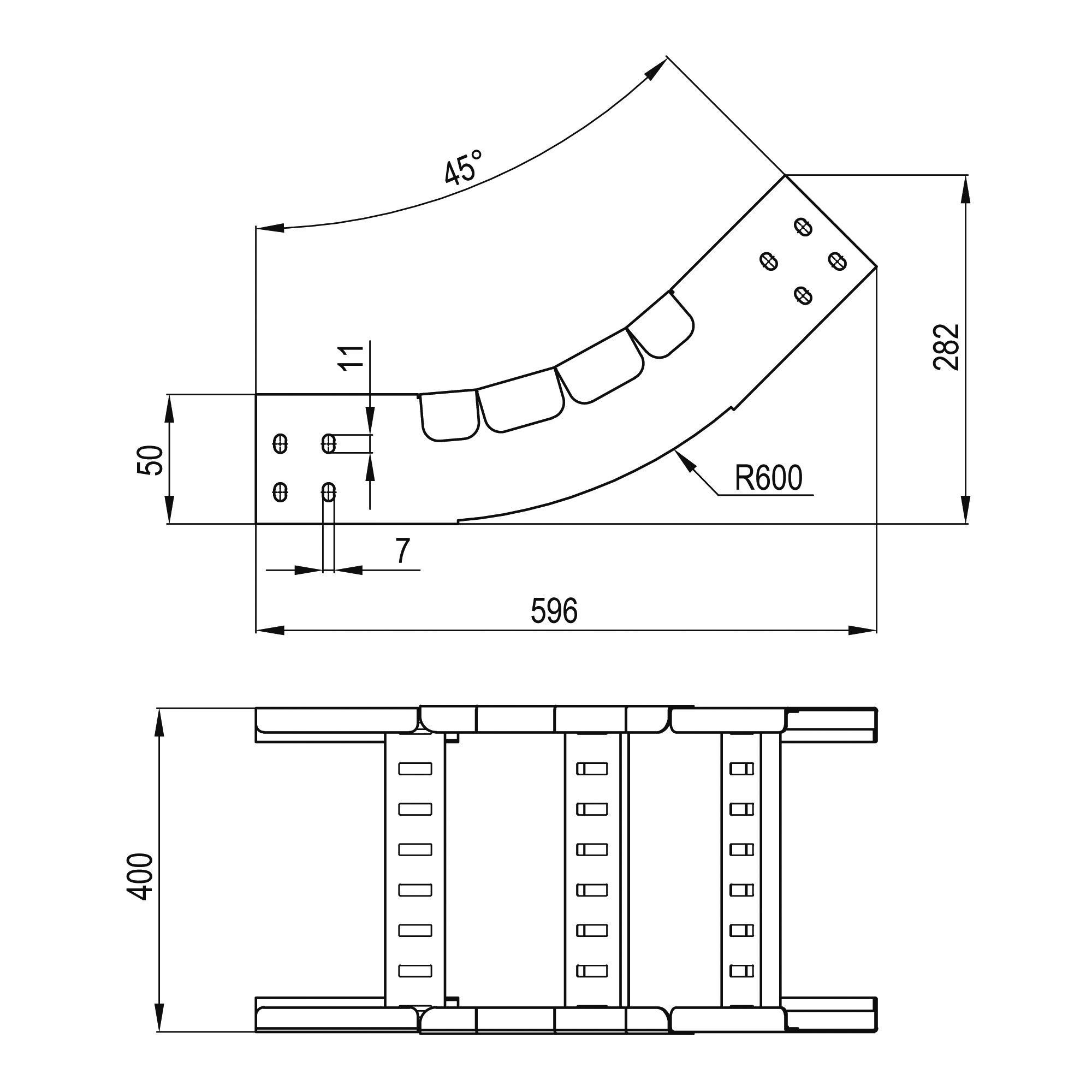 LH0564K Угол вертикальный внутренний 45 градусов 50х400 R600 в комплекте с крепежными элементами и соединительными пластинами DKC