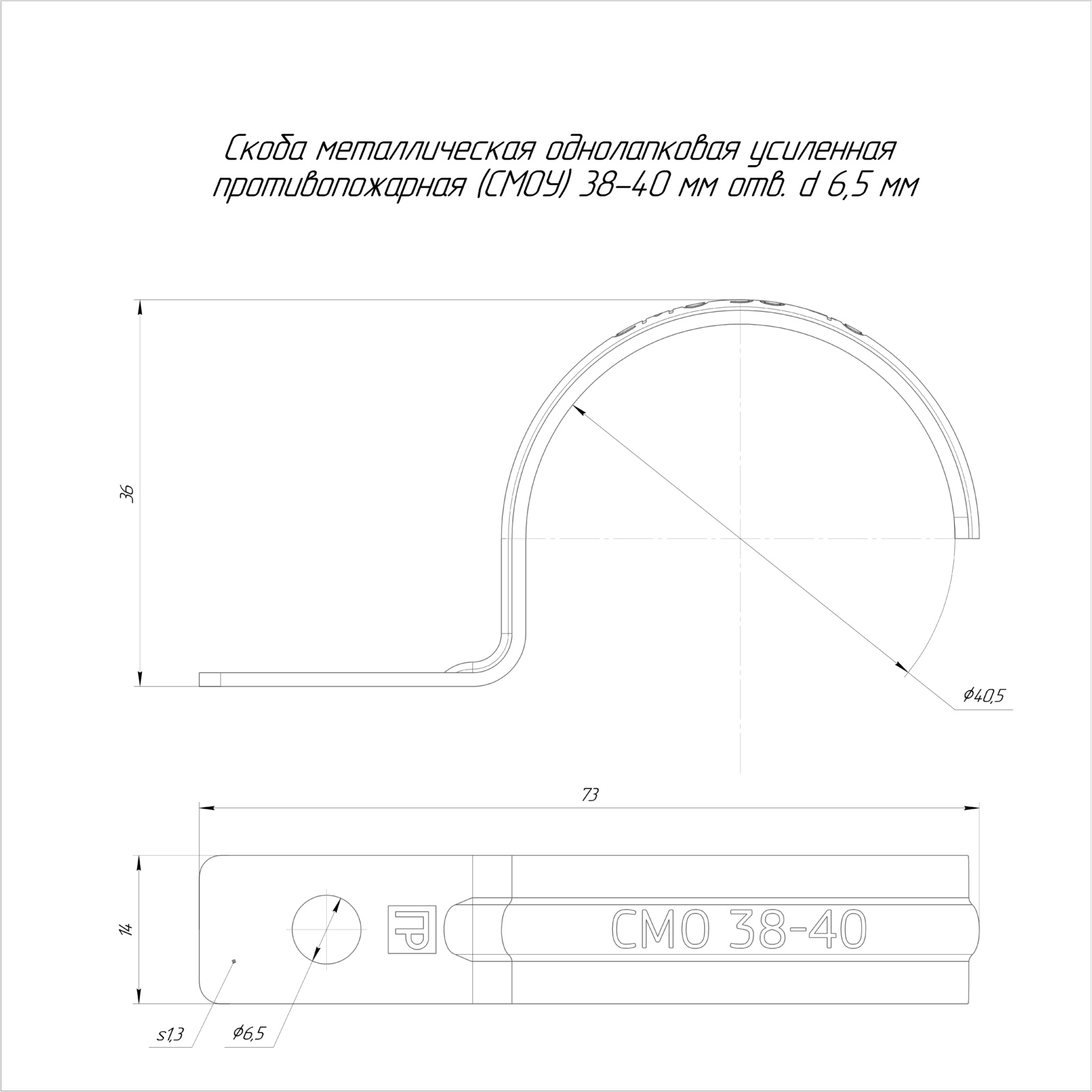 PR13.02429 Скоба металлическая однолапковая усиленная противопожарная СМОУ d38-40 мм отв. d 6,5 мм (50 шт/уп) Промрукав